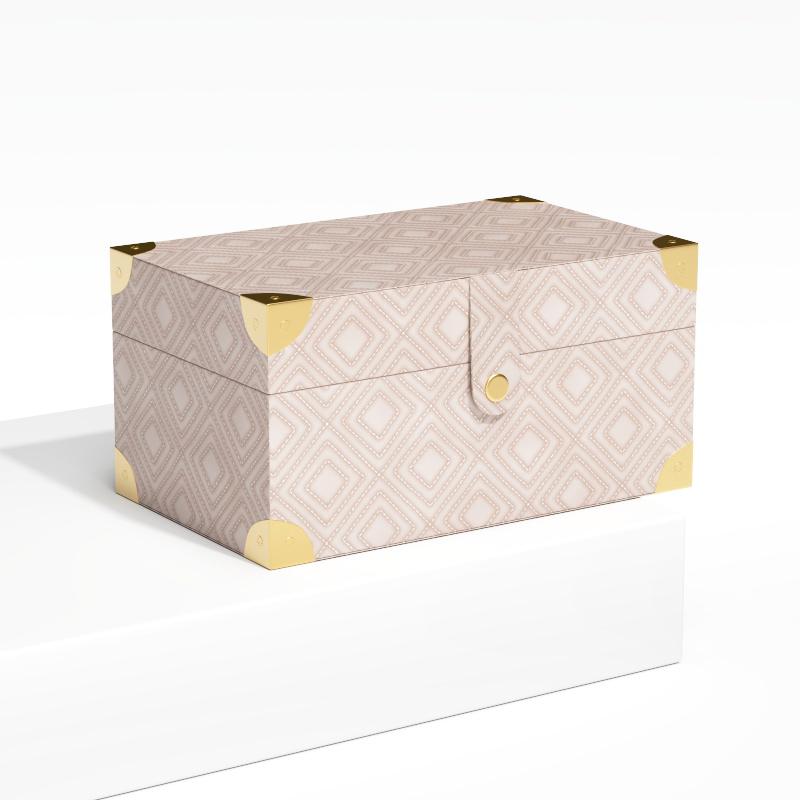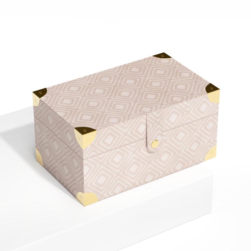 صُمم الجزء الداخلي من العلبة ليحمل زجاجة عطركِ بأمان، ويحميها من أي ضرر محتمل. التفاصيل الدقيقة واللمسة النهائية الرائعة لجلد البولي يوريثان تجعل هذه العلبة قطعةً أنيقةً تُضفي لمسةً من الأناقة على أي خزانة ملابس.